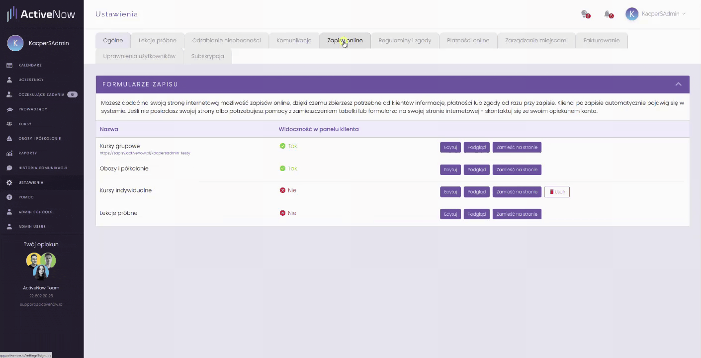 Wiadomości dotyczące zapisów znajdziesz, przechodząc do zakładki ustawienia → zapisy online, edytując formularz zapisowy.