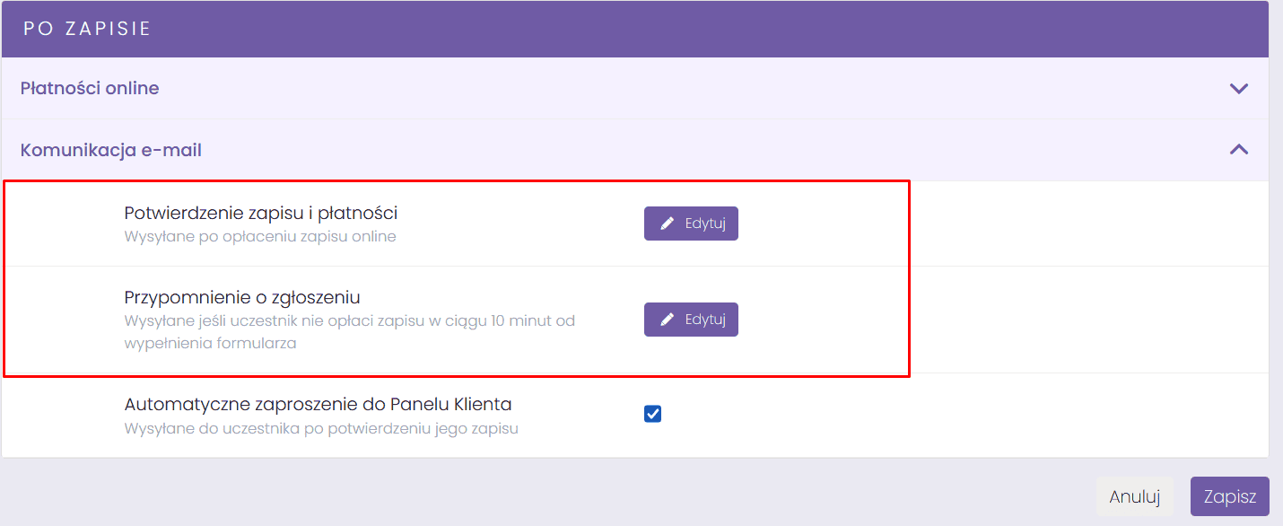 W sekcji Po zapisie → Komunikacja e-mail możesz edytować treść takich wiadomości jak: