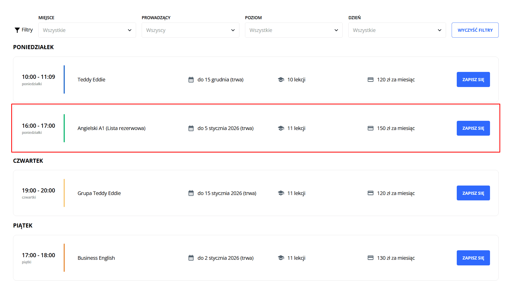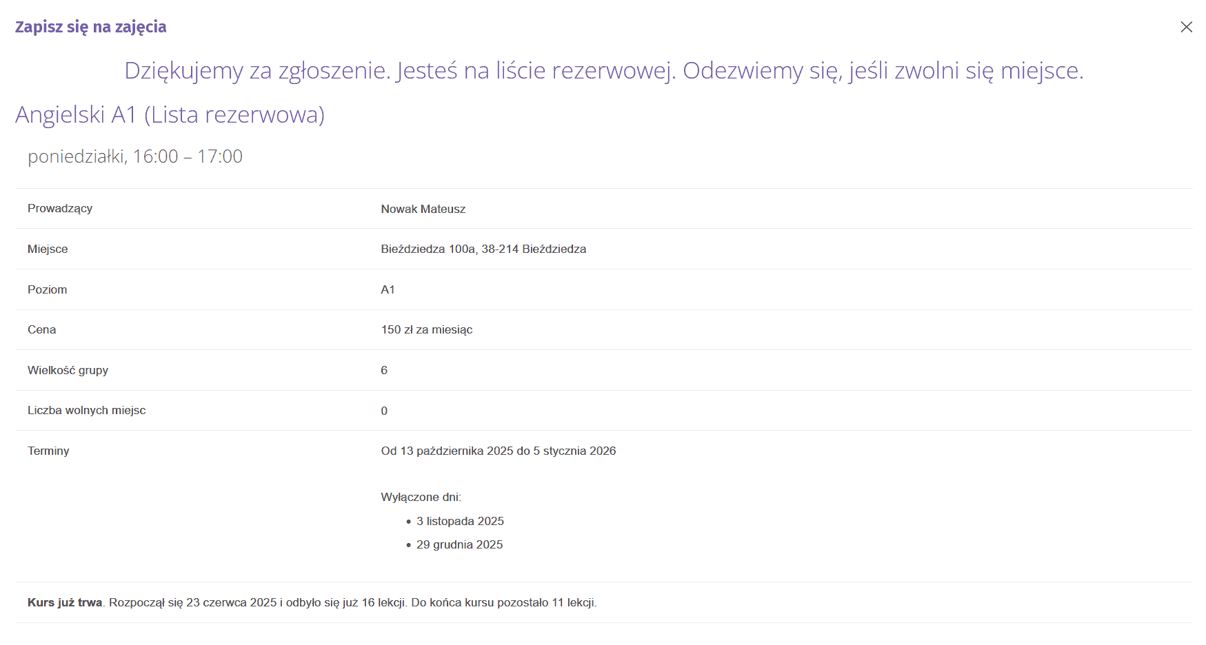 Rodzic może zapisać się do pełnej grupy w tabeli zapisowej – bez ponoszenia opłaty. Taki zapis trafia na listę rezerwową i oczekuje na zwolnienie miejsca w kursie.