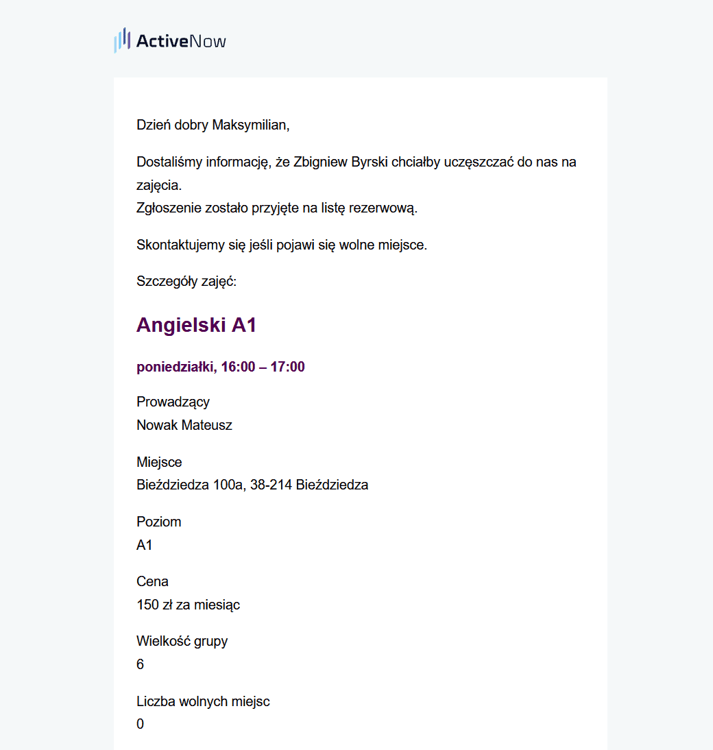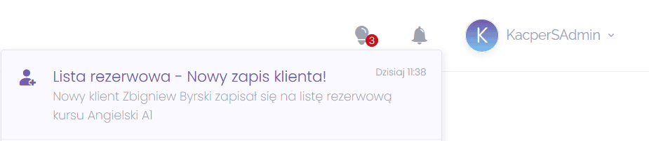Kiedy uczestnik zapisze się na listę rezerwową, w ActiveNow pojawi się powiadomienie, które po kliknięciu przekieruje Cię bezpośrednio do danego kursu.