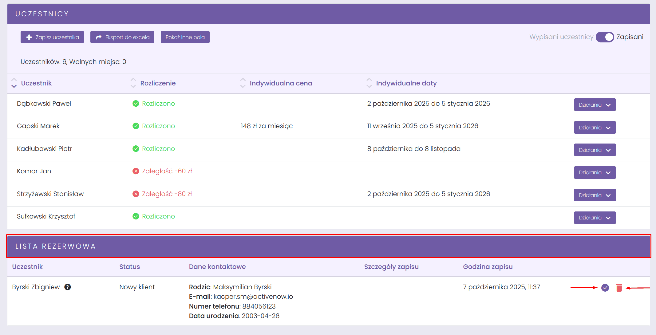 Gdy któryś z uczestników zrezygnuje, możesz wypisać go z kursu, a następnie zaakceptować kolejną osobę z listy rezerwowej. Dzięki temu zachowujesz pełne grupy i nie tracisz przychodu.