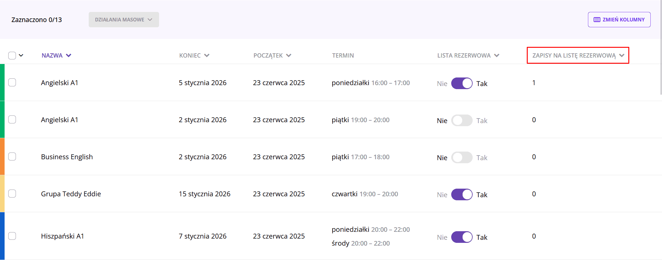 W zakładce Kursy możesz włączyć kolumnę Zapisy na listę rezerwową, w której widzisz liczbę osób zapisanych na listę w każdym kursie.