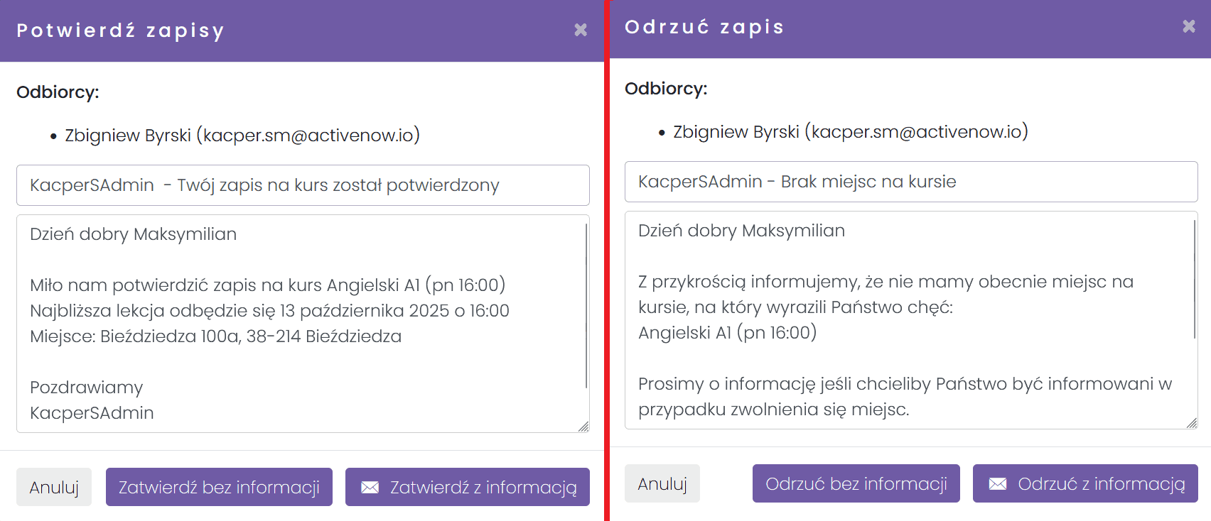 - zaakceptować lub odrzucić zapis z potwierdzeniem, wtedy uczestnik otrzyma wiadomość e-mail o dodaniu do kursu,
