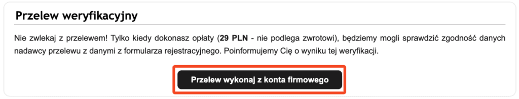 Po zalogowaniu do panelu PayU kliknij przycisk Przelew wykonaj z konta firmowego. Zostaniesz przekierowany do widoku, w którym będziesz mógł wykonać przelew. Jest to jednorazowa opłata w wysokości 29 zł.