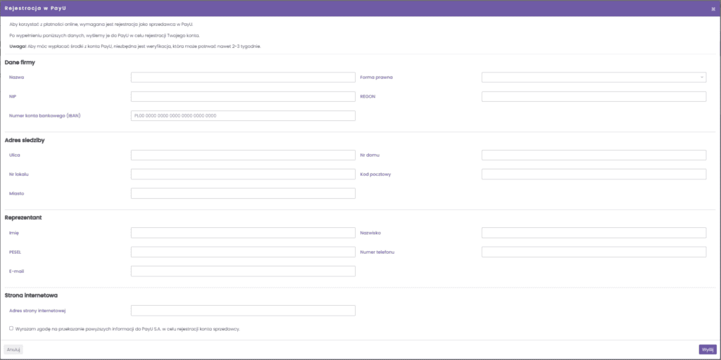 Po wybraniu opcji Zarejestruj się w PayU wyświetli Ci się formularz zgłoszeniowy, w którym będziesz musiał uzupełnić dane Twojej firmy, reprezentanta oraz adres siedziby.