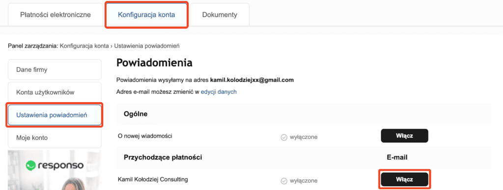 3. W sekcji Przychodzące płatności kliknij Włącz